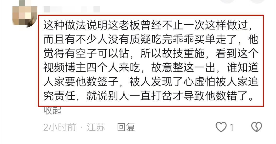 有意思的是,店老闆一開始同意重新數籤子,結果數了2根,就把籤子往桌子上一甩,態度非常惡劣地說讓網友她們4人自己數。
