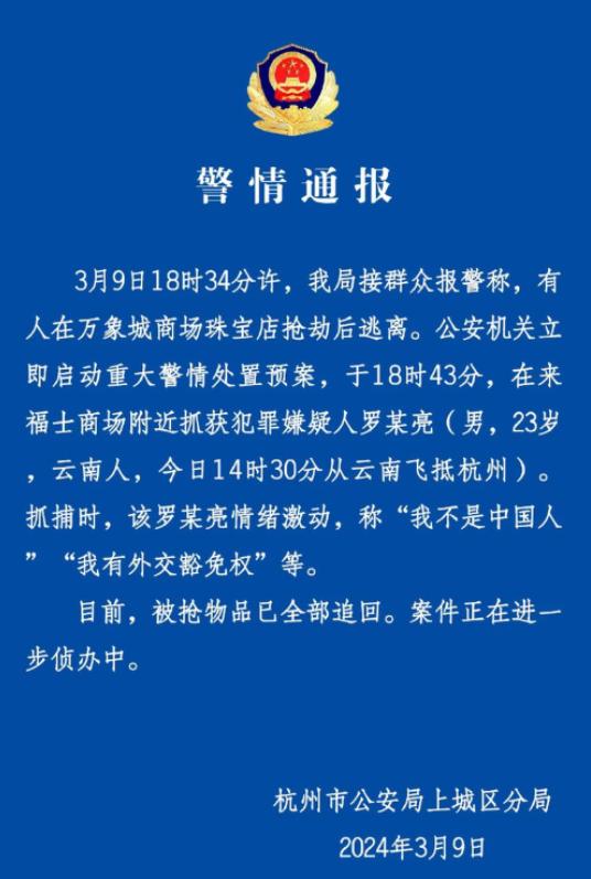 太囂張!杭州萬象城金店被搶,劫匪被抓後大喊:我不是中國人