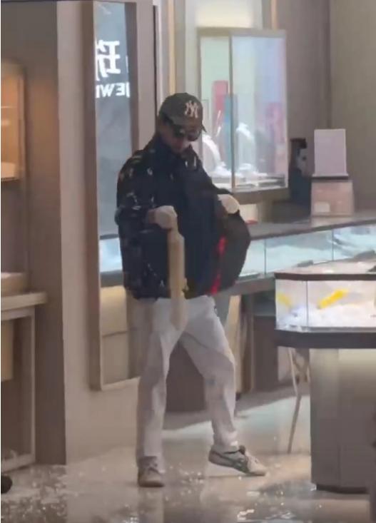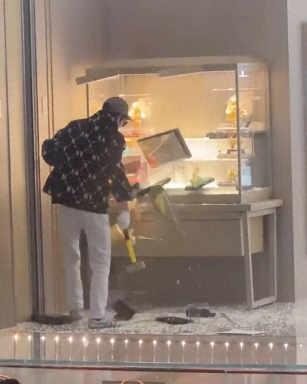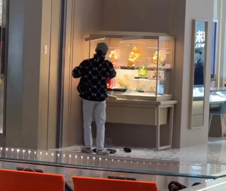 隨後他又走進店內,將店內展示珠寶黃金的展示櫃砸碎,繼續向自己的揹包裏裝珠寶黃金。