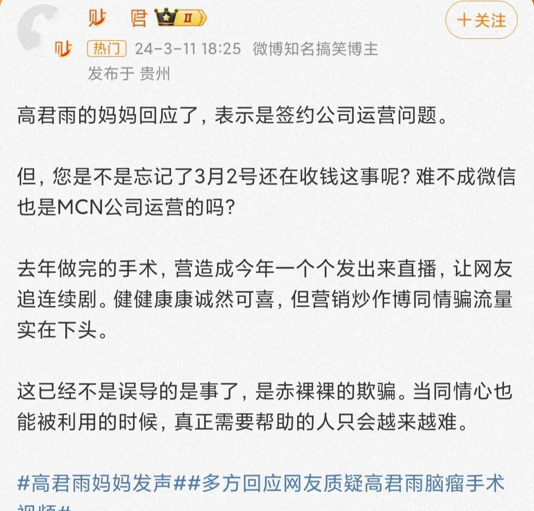 萬萬沒想到,有知情網友透露,高君雨去年十月份就已經做完手術,而賬號發佈的視頻,並沒有明確說明這一點,讓大家誤以爲就是這幾天發生的事情,因此引發了爭議。
