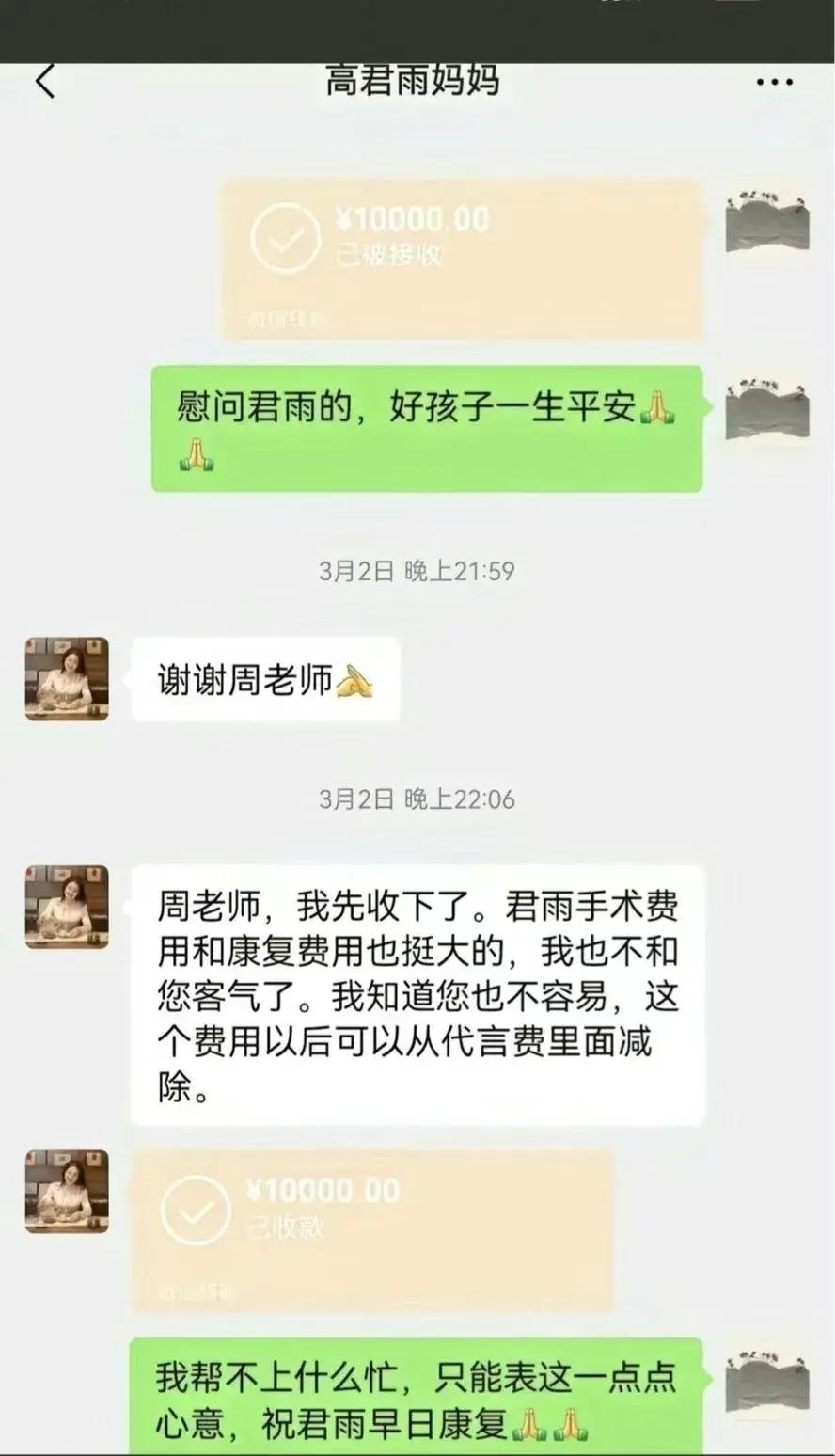 網上還曬出疑似高君雨媽媽在近日收取慰問金的聊天截圖,是真是假?不得而知,如果真的是去年已經做完手術,還這麼做,確實有些難以理解。