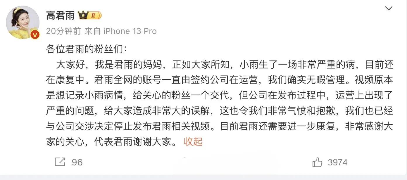 高君雨媽媽稱小雨生了一場比較嚴重的病,目前還在康復中,賬號一直由簽約公司運營,視頻本想記錄女兒的病情,公司發佈過程中出現問題,讓我們十分憤怒,經過交涉決定停止更新。