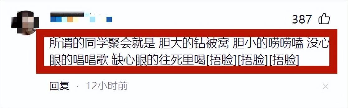 得知這些信息,有網友調侃“所謂的同學聚會就是膽大的鑽被窩,膽小的嘮嘮嗑,沒心眼的唱唱歌,缺心眼的往死裏喝。”