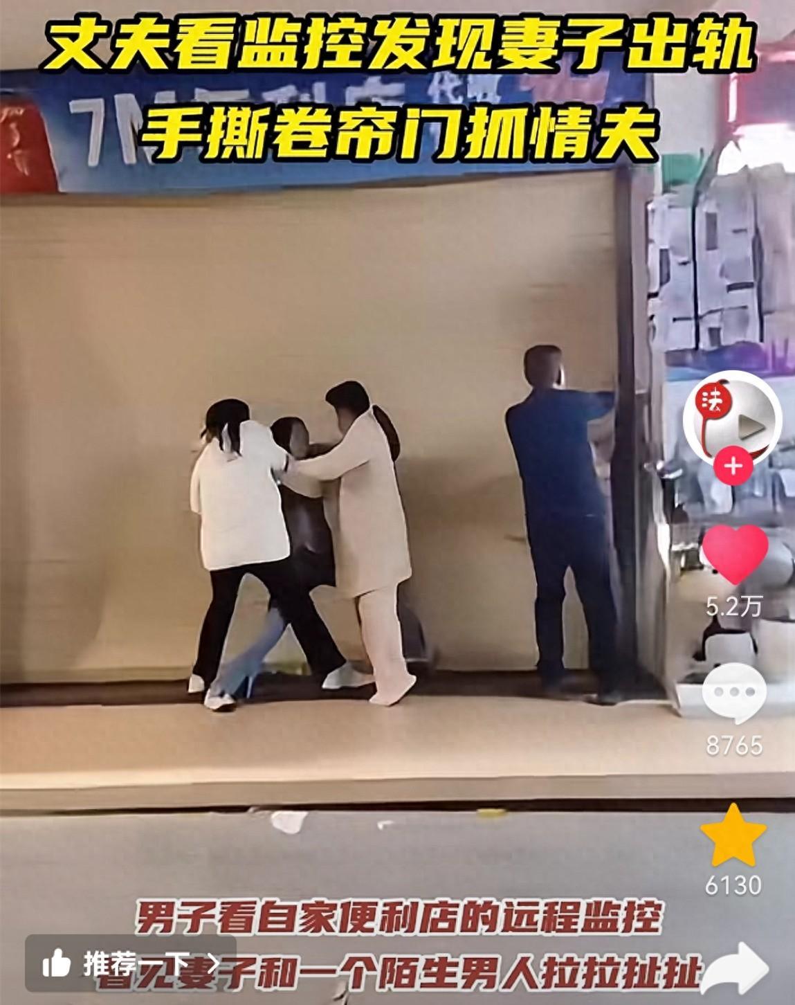 從視頻中可以看到,在監控中看到妻子和其他男人在自家便利店裏親密接觸後,丈夫非常憤怒的趕到了便利店。