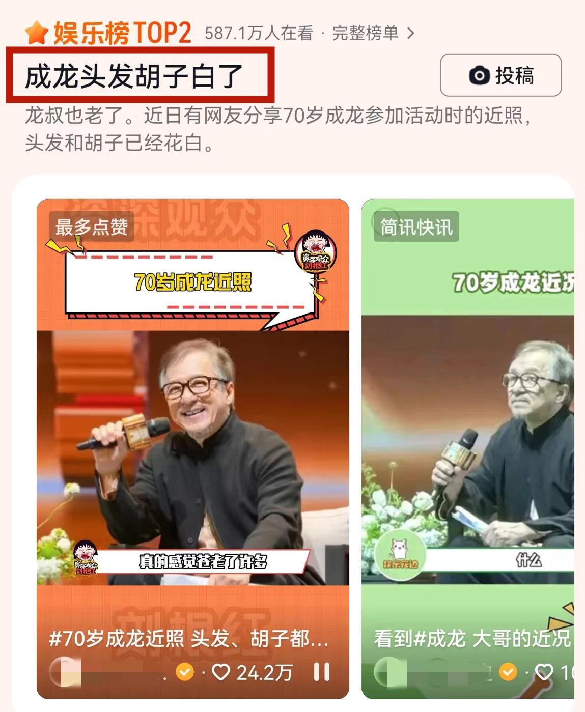從現場照片和視頻中可以看到,成龍頭髮和鬍子都白了,臉上皺紋、老年斑明顯,完全不是大家印象中生龍活虎、意氣風發的樣子。