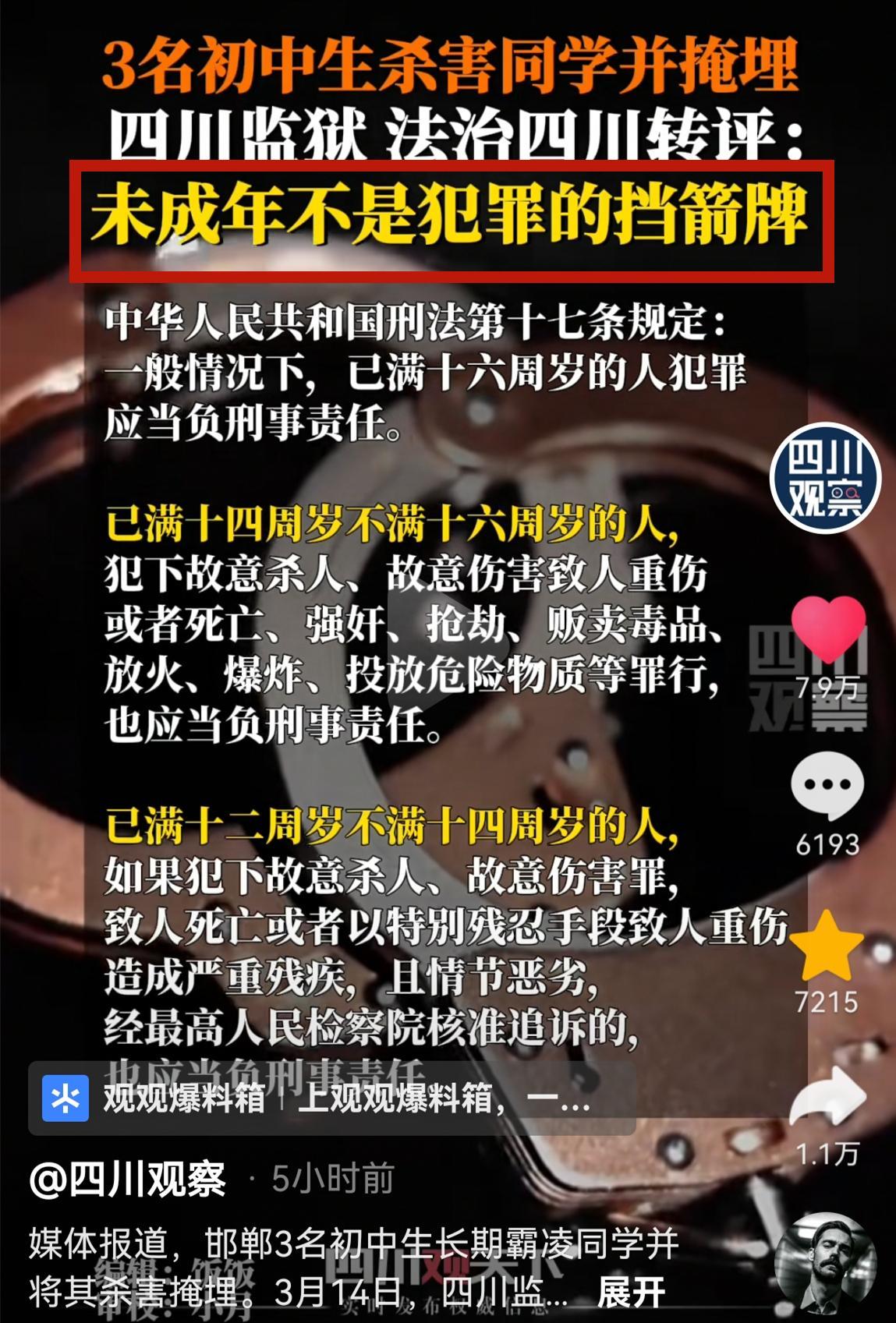 有網友說“未成年人保護法不能成爲殺人兇手的擋箭牌。”