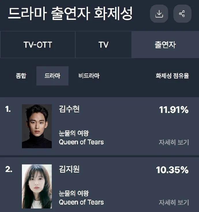 演員話題榜上,金秀賢與金智媛也分別佔據了第一和第二的寶座。