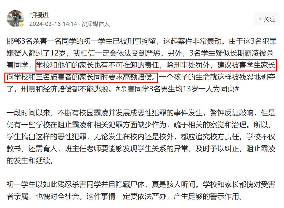 胡錫進說3名學生的家長有不可推卸的責任,他建議小光的家長向3名學生的家長要求高額賠償。