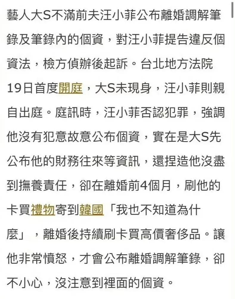 簡單科普一下事情的起因,汪小菲此前在網上曬出離婚協議,泄露大S個人賬號以及家庭主住址等信息,因此被前妻以侵犯隱私權告上法庭,案子一直拖到現在。