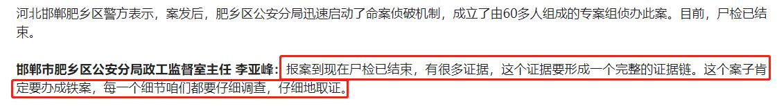 警方說“報案到現在屍檢已結束,有很多證據,這個證據要形成一個完整的證據鏈。這個案子肯定要辦成鐵案,每一個細節咱們都要仔細調查,仔細地取證。”