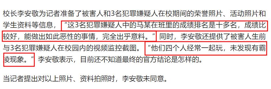 校長還特意提到“這3名犯罪嫌疑人中的馬某在班裏的成績排名是十多名,成績比較好,能做出如此惡性的事情,完全出乎意料。”