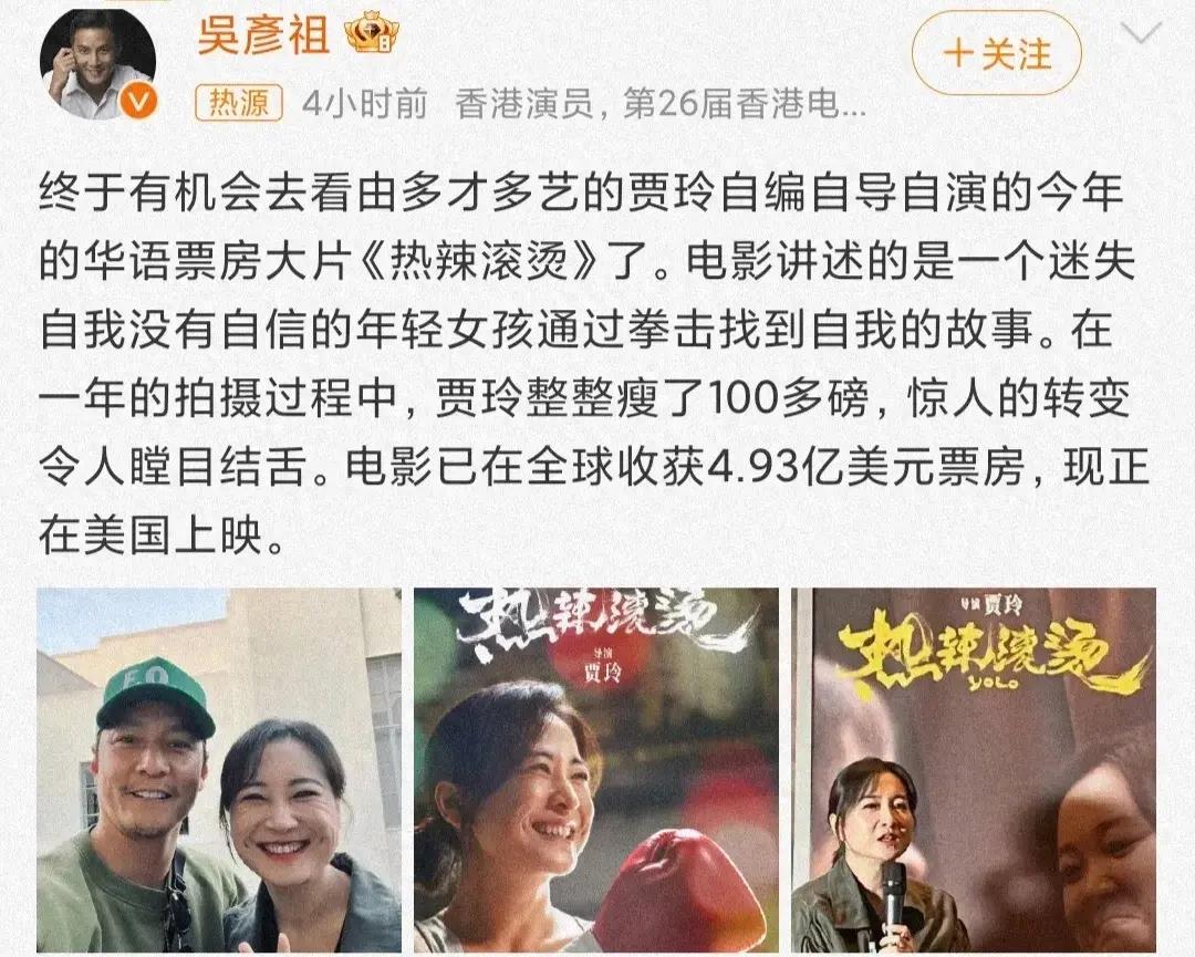 3月21日,賈玲登上熱搜,這一次,不是因爲新電影的票房,而是吳彥祖在社交平臺曬出一組與賈玲的合影,引發網友熱議。
