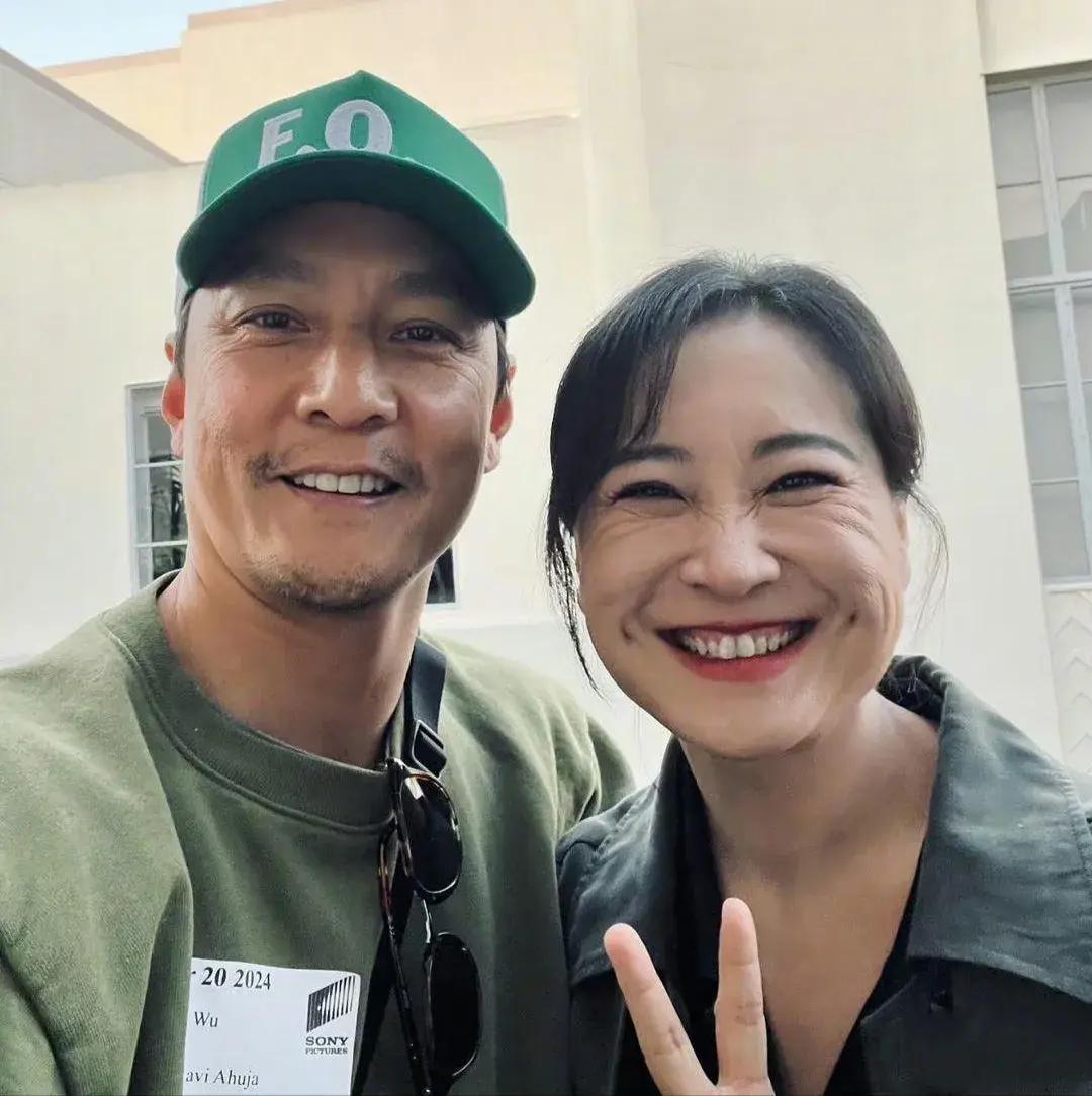 照片中,吳彥祖一身休閒打扮,戴着棒球帽,鬍子拉碴,一點不修邊幅,不過,還是非常帥氣,賈玲對着屏幕開心比手勢,說實話,很久沒有看到這麼燦爛的笑容了。