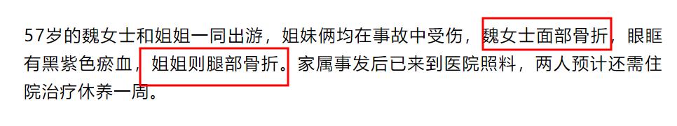 乘客魏女士面部骨折,眼眶有黑紫色淤血,她的姐姐腿部骨折。