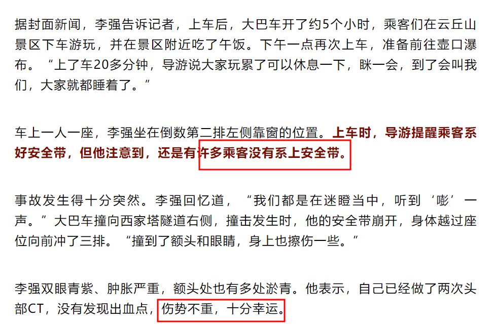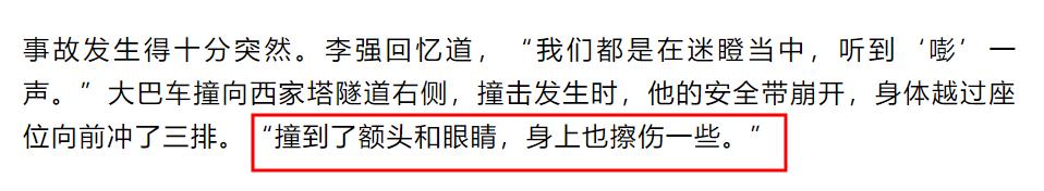 事故發生時,李強身上的安全帶崩開,他的身體直接越過座位向前衝了3排,好在他受傷不嚴重,這算是不幸中的萬幸。