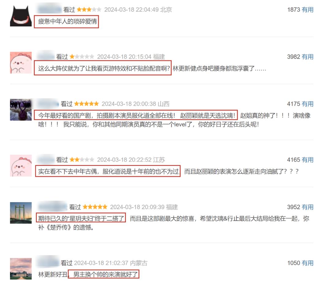 有許多主演粉絲和劇迷打出了滿分的好評,但同時也出現了很多一星的差評,給出了“疲憊中年人的瑣碎愛情”的評價。