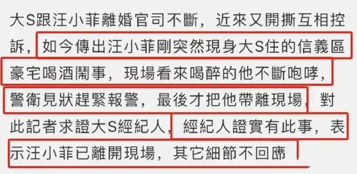 隨後,據臺媒報道,汪小菲藉着酒勁跑到大S所住的豪宅鬧事,不停的大聲咆哮,小區警衛看到這種情況,只好選擇報警,最後,汪小菲被帶離現場。