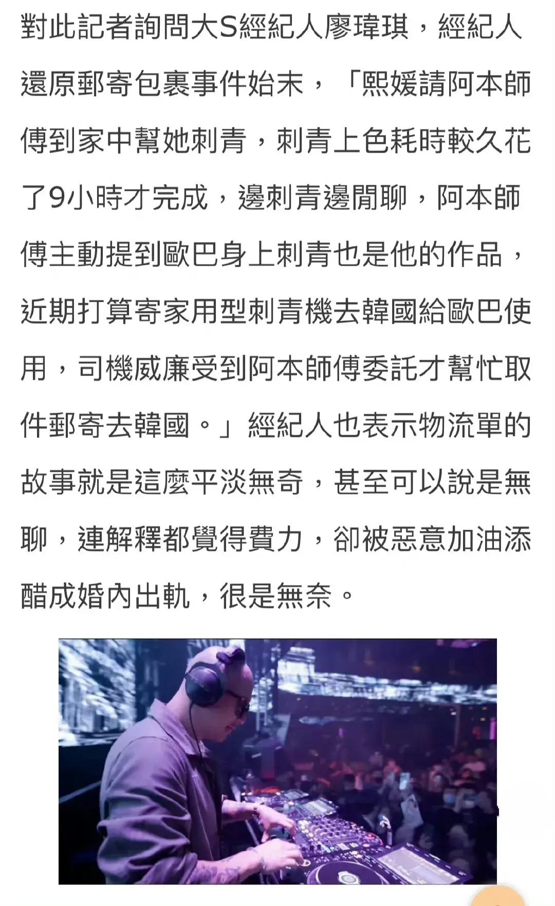 此外,大S經紀人廖瑋琪也還原郵寄包裹事件的經過,大體上跟刺青師的解釋差不多,最後還特意提到,原本很小的一件事,卻被人添油加醋的說成婚內出軌,十分無奈。
