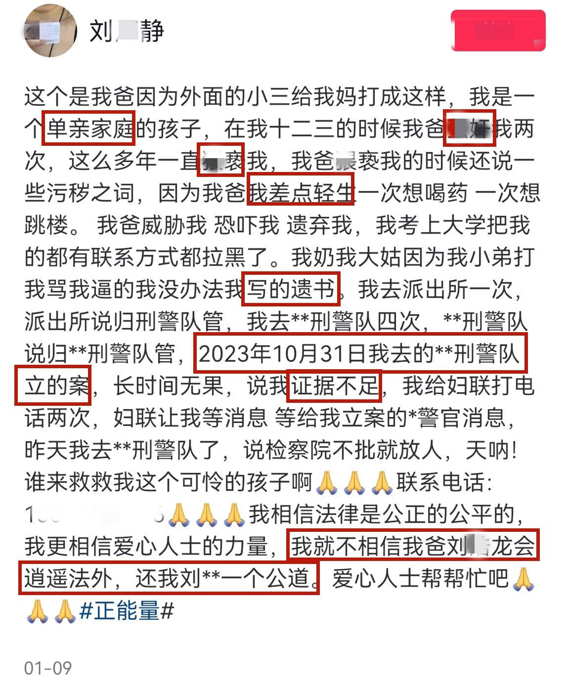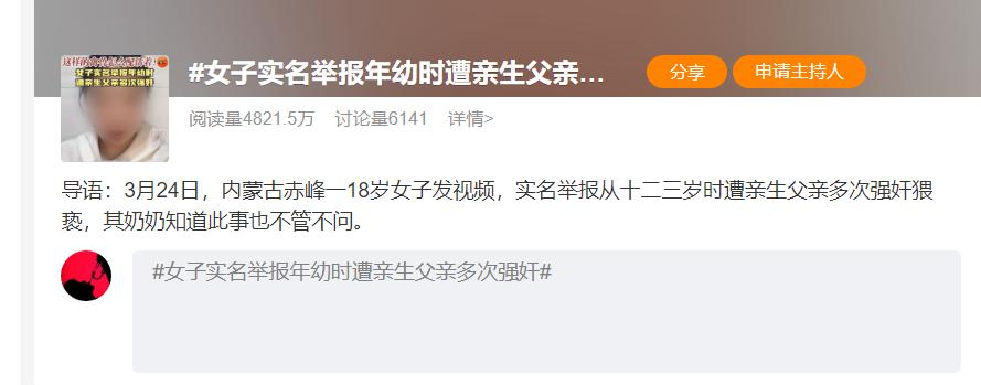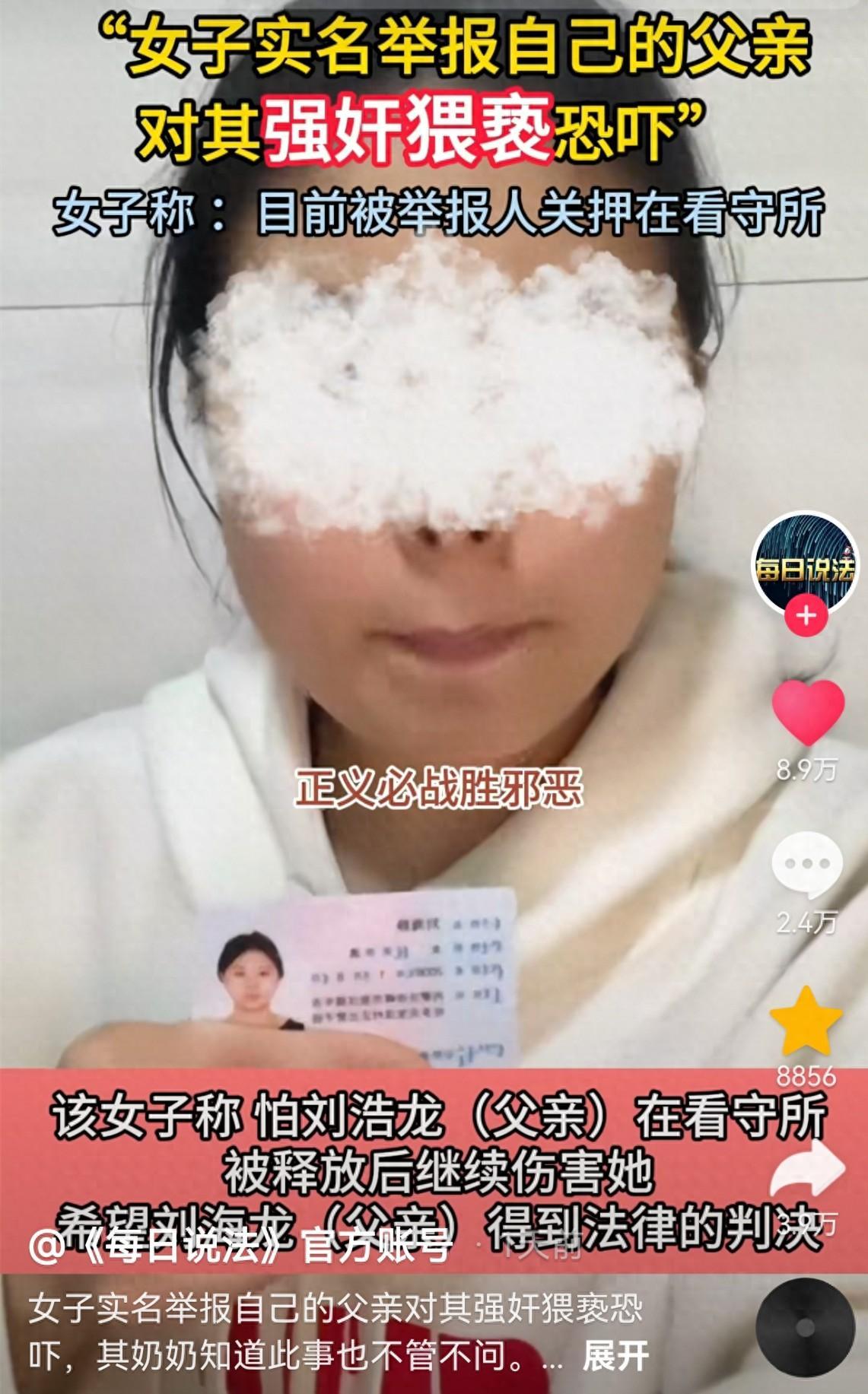 近日,內蒙古女子劉某靜在社交賬號手舉身份證,實名舉報父親劉某龍強姦猥褻自己,3月24日,媒體對此事進行了報道。