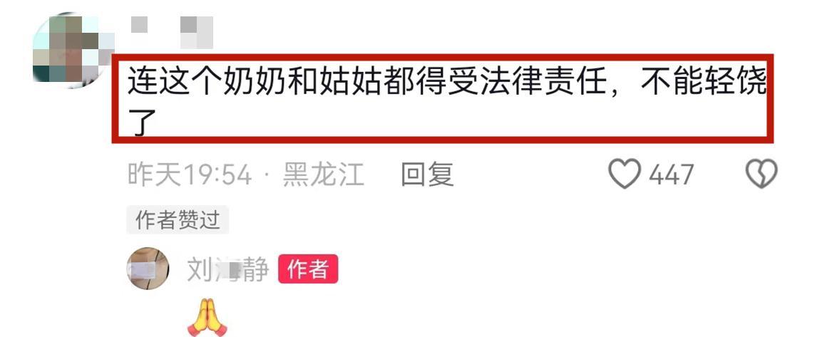 還有網友表示劉某靜的奶奶和姑姑也得承擔法律責任,不能輕饒了。