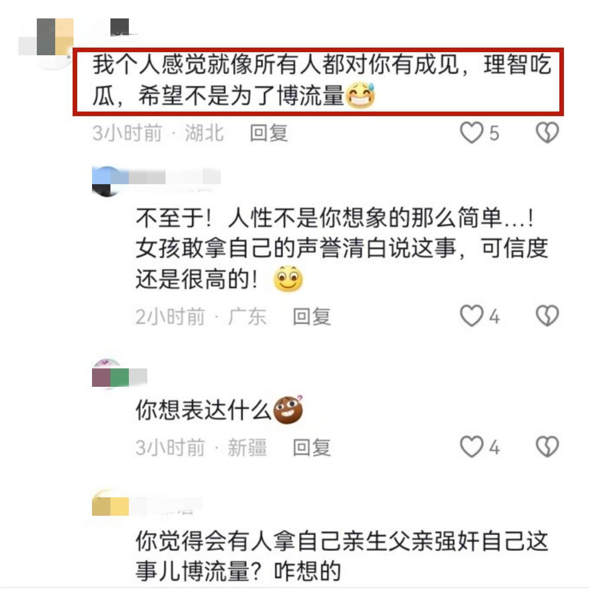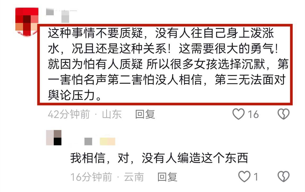 回懟的網友說“這種事情不要質疑,沒有人往自己身上潑髒水,況且還是這種關係。這需要很大的勇氣!就因爲怕有人質疑,所以很多女孩選擇沉默。她們第一害怕名聲變壞,第二害怕沒人相信,第三無法面對輿論壓力。”