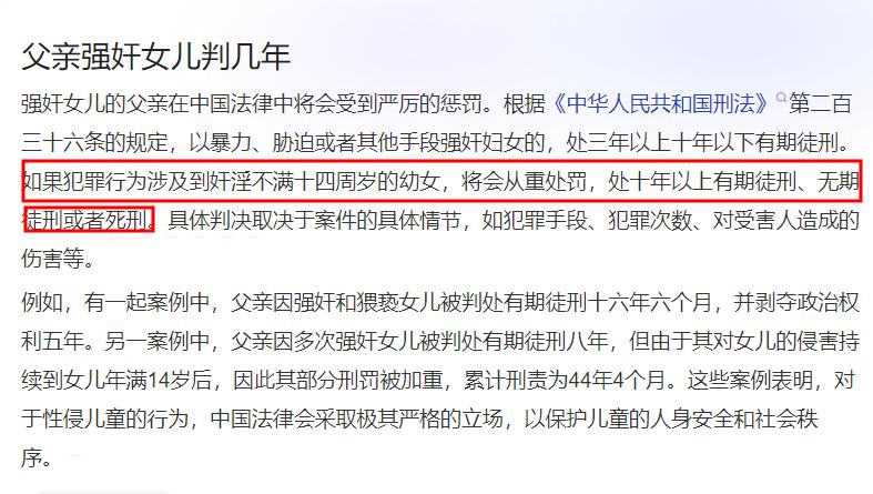 筆者查詢相關法律條款得知,強姦不滿14週歲的幼女,根據犯罪手段、犯罪次數、對受害人造成的傷害等因素,最低判處10年以上有期徒刑,最高可至無期徒刑或死刑。