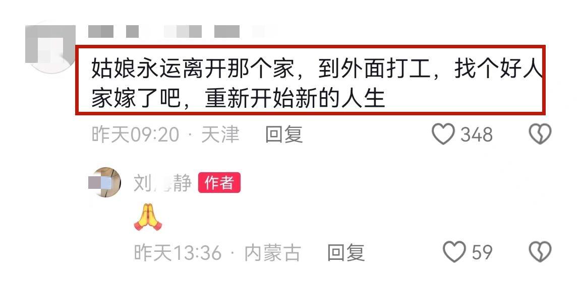 有網友建議她在這件事情結束之後,永遠離開這個家,到外面打工,找個好人家嫁了,重新開始新的人生。