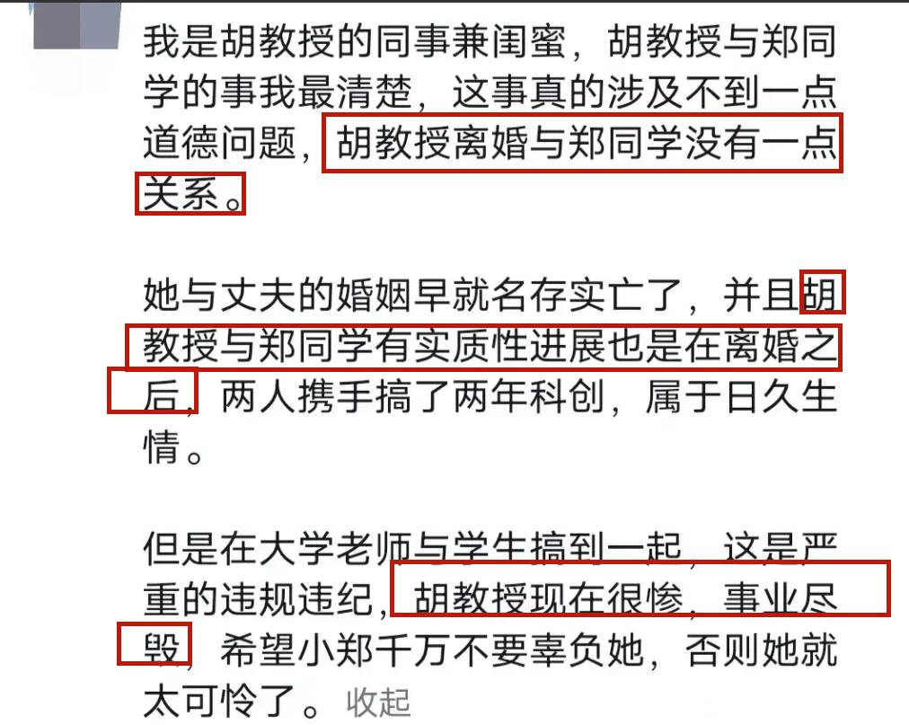 爆料者還稱胡教授現在已經離婚了,但在離婚之前已經與鄭同學好上了。
