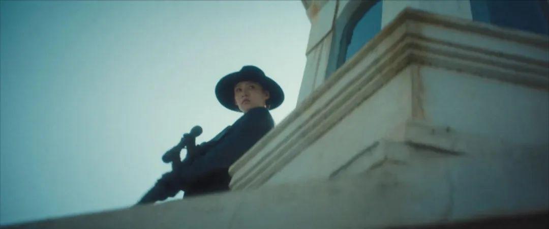 鏡頭一轉,我方同志沈近真(李沁飾)正躲在一棟大樓的樓頂,端着狙擊槍準備營救我方被捕同志。