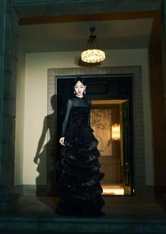 只看唐嫣發出來的精修圖,這件禮服就像是黑色小魔女的禮服。