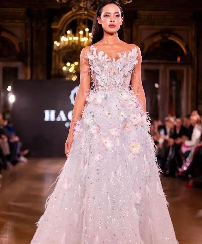 這件禮服是來自Hacchic Couture 2024秋冬系列,據說是用2000片羽毛縫製而成,看起來兼具輕盈和貴氣,宛若人間精靈。
