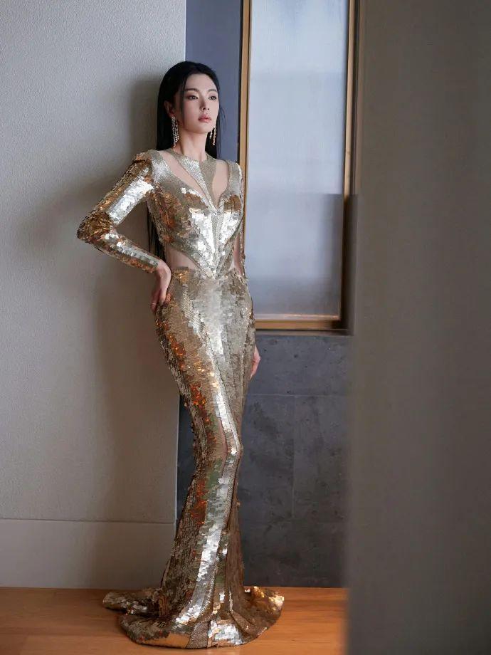 金色亮片包裹全身,在鎖骨和腰間特地增加了露膚度,搭配黑長直的髮型,完全就是“機械姬”的感覺。