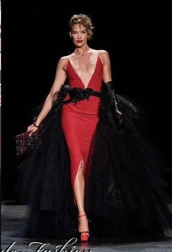 身着 Julien Fournié 2024春季高級定製系列,長驅直入的深V領口搭配紅色裹身裙,腰間的黑色紗質點綴也長拖尾,讓這件裙子又多了幾分神祕魅惑之感。