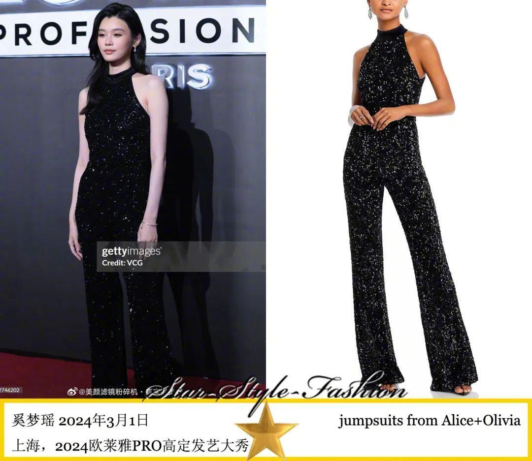 很早就登場穎兒身着alice+olivia黑色亮片圈領挖肩連身褲亮相,這身連體褲和她非常適配。