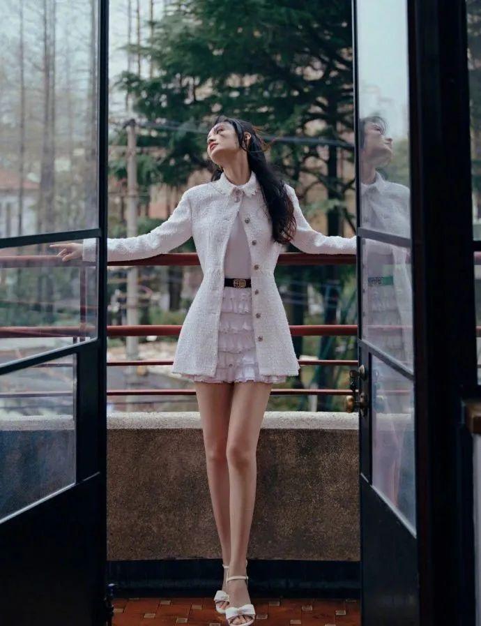 這身白色套裝來自Chanel 2024春夏系列,亮片外套與荷葉邊短裙相得益彰。