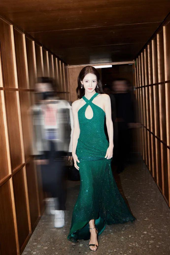 這身Alexis Mabille 2022秋冬高定,用看着就很有質感的森林綠作爲主色,更凸顯了金晨白皙的皮膚。