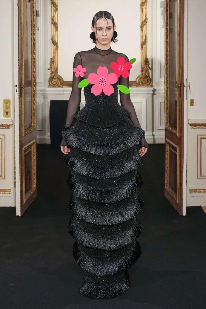 若是對比一下模特圖,這件禮服還真是大膽,這裏青石稍稍打個碼。
