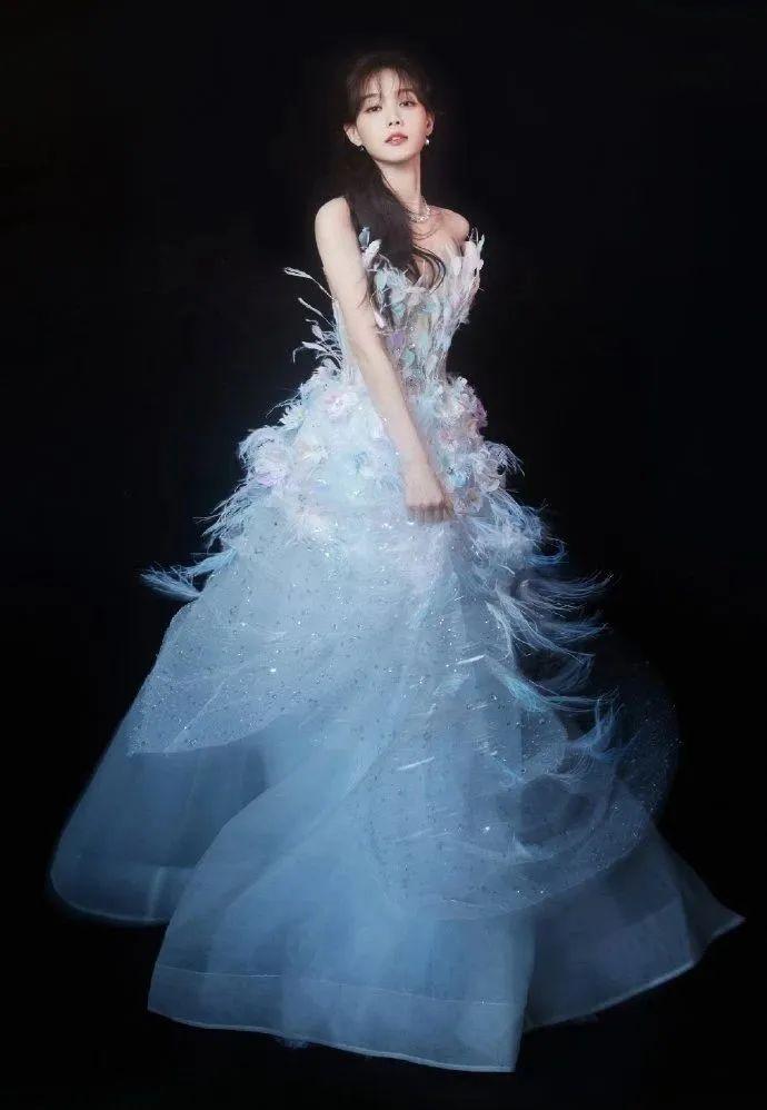 純黑色底色爲背景,淺藍色羽毛禮服在身上,羽毛飛揚,五官精緻,有一種不染纖塵的美。