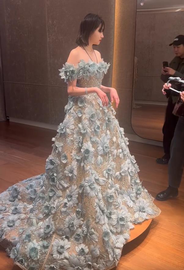 禮服上的低飽和度的藍色羽毛花朵造型每一朵都很重工,把人也襯得更加嬌媚起來。