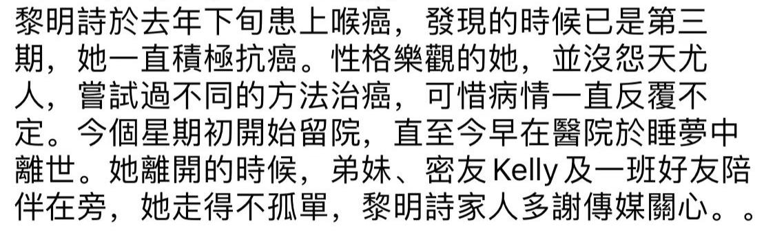 再聽到黎明詩的消息,便是她確診喉癌了,果真是天妒紅顏。