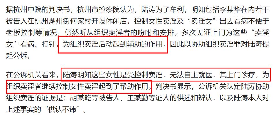 杭州市檢察院認爲陸濤爲了牟利,明知包括李某華在內若干被告人在杭州湖州街何家村開設休閒店,控制女性賣Y及“賣Y女”出去看病不便於老闆控制等情況,仍然聽從組織賣Y者的吩咐和安排,多次無證上門爲這些“賣Y女”看病、打針,爲組織賣Y活動起到輔助的作用。