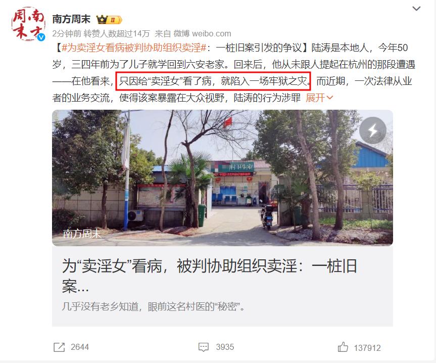 根據南方週末的報道,這是一起醫生爲賣Y女(失足婦女)看病,被判協助組織賣Y的案子,案件中的涉事醫生被判有期徒刑一年六個月。