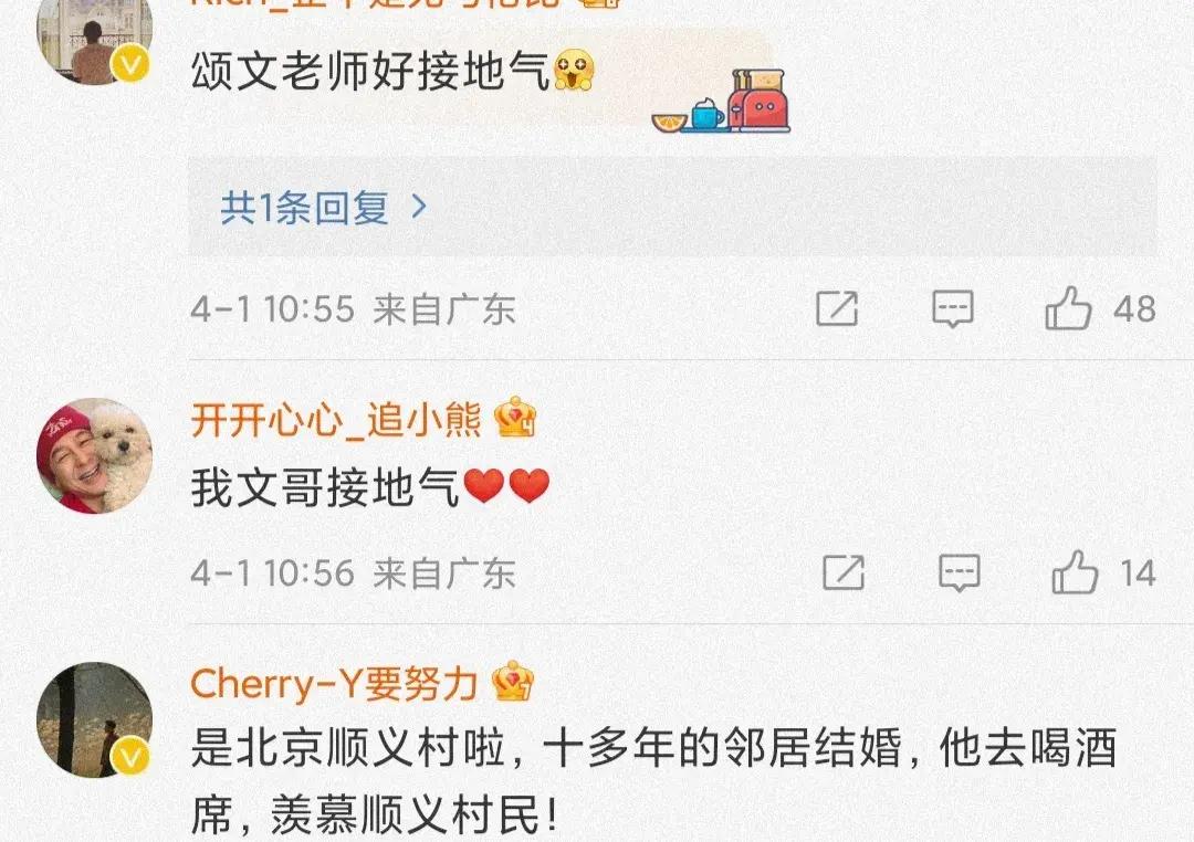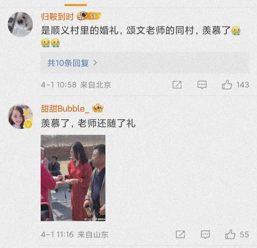 有網友表示,小熊老師還隨禮了,不知道包了多少,羨慕了,並透露這是順義村裏的婚禮,頌文老師的同村,十多年的鄰居結婚,好羨慕這裏的村民,還調侃,誰這麼大的排場,能上高啓強參加他的婚禮。