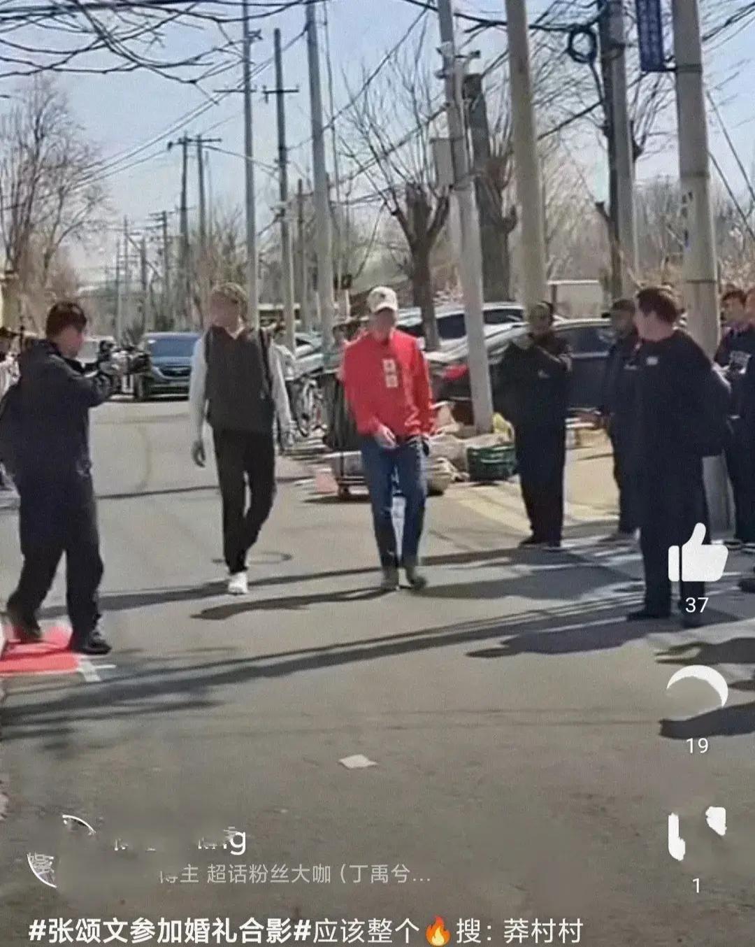 來到舉辦婚禮的酒店門口,一些村民紛紛上前合影,張頌文老師也是來者不拒,面帶笑容,表情十分自然,絲毫沒有明星架子,看起來特別的隨和,或許是參加婚禮,才特意穿了紅色上衣,還挺帥氣。