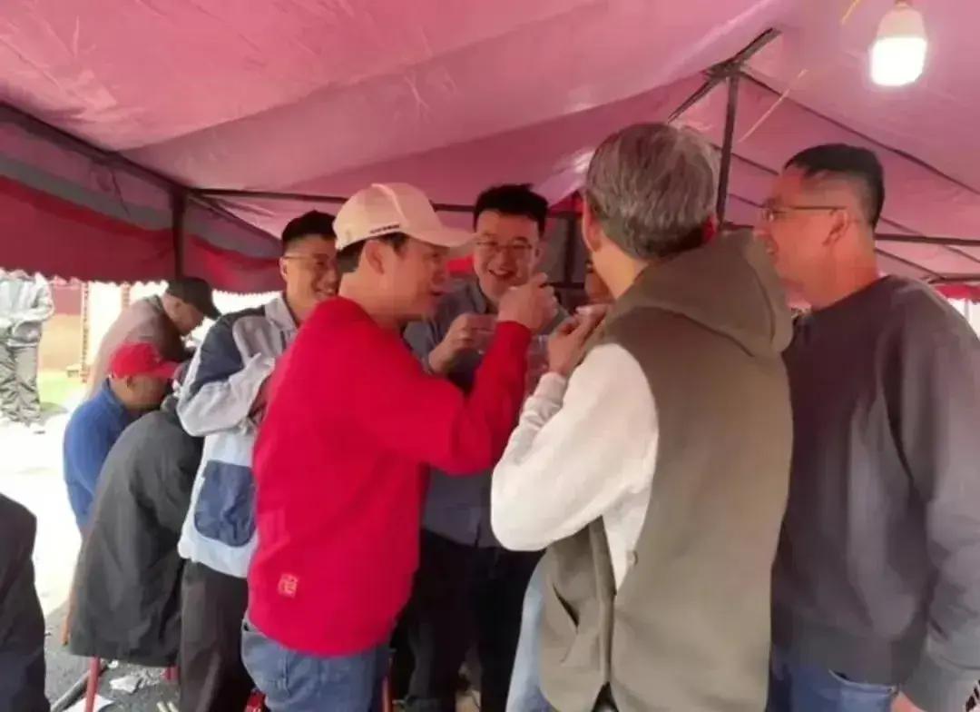 不過,隨着網上曬出更多的現場視頻,還看到張頌文與村民一起喫席的畫面,桌子上放着啤酒和飲料,還有人特意拿出一瓶白酒,四周環境有些簡陋,還搭着帳篷,生活在從村的小夥伴,想必特別熟悉這樣的場景。