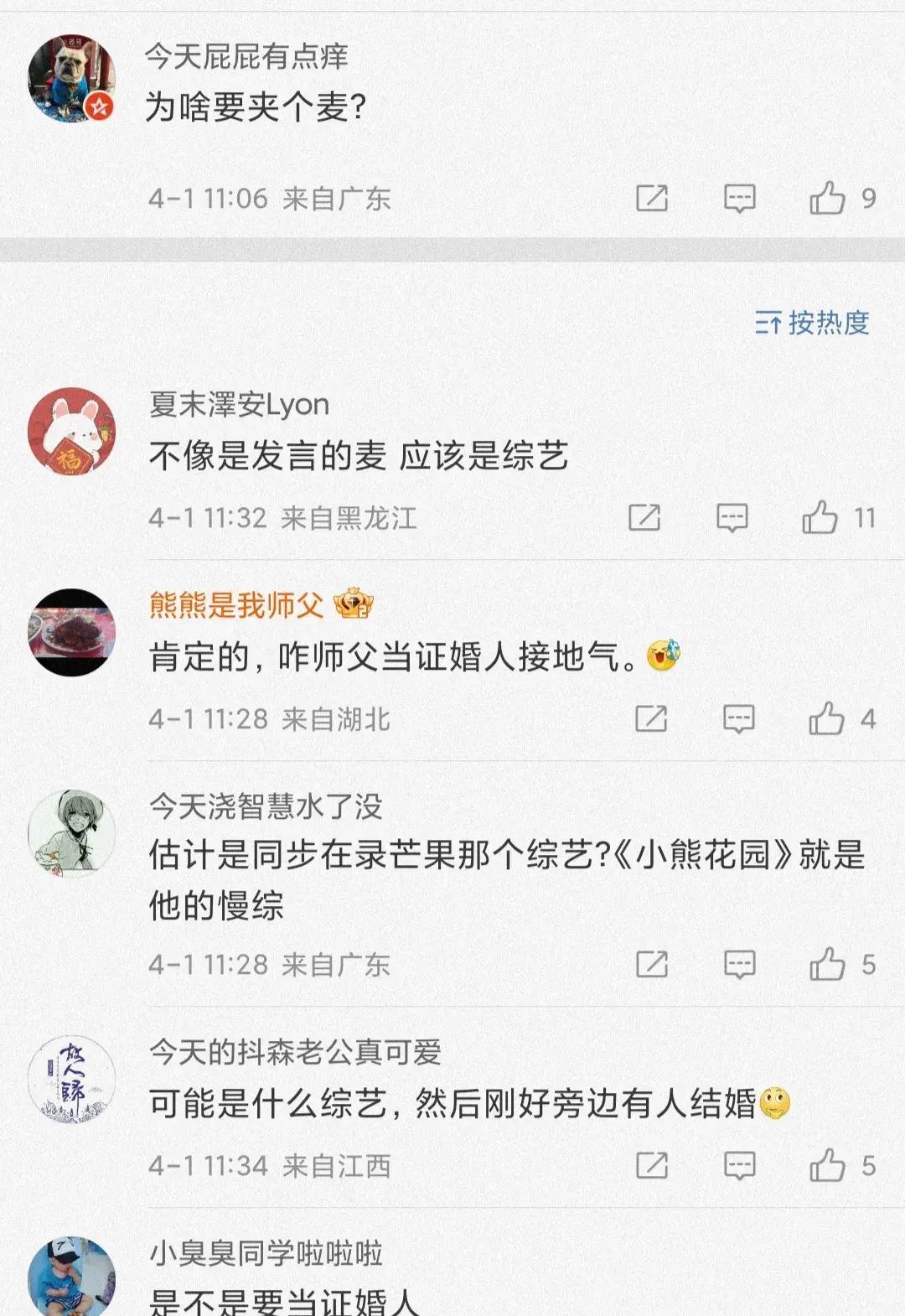 也有網友發現張頌文的領口一直戴着麥克風,因此,猜測可能在錄製綜藝節目,剛好遇到有人結婚,不過,可能性不大,如果只是路過,不可能聊的那麼開心,一看就特別熟悉,還有人覺得可能在婚禮上當證婚人或者主持人,戴着麥克風,是爲了上臺講話,到底什麼情況?不得而知。