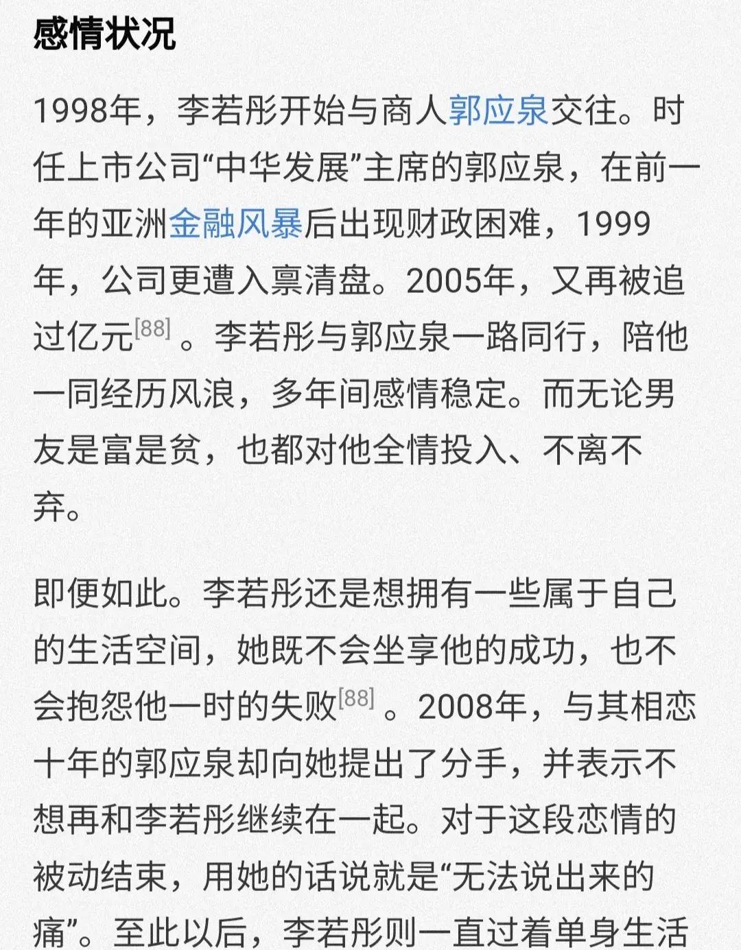 出於好奇,特意到網上科普一下,發現感情經歷和緋聞都很少,有資料可查的,只有李若彤與郭應泉的一段戀情,陪着男方走過風風雨雨,不離不棄,十年相愛,所有人都努力和付出,換來無情的分手。
