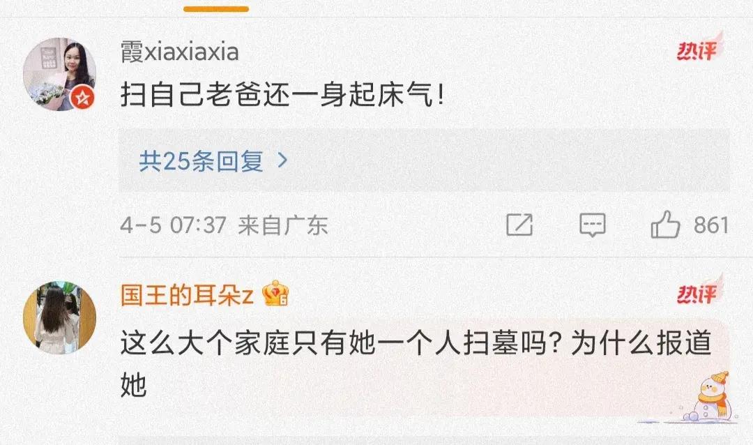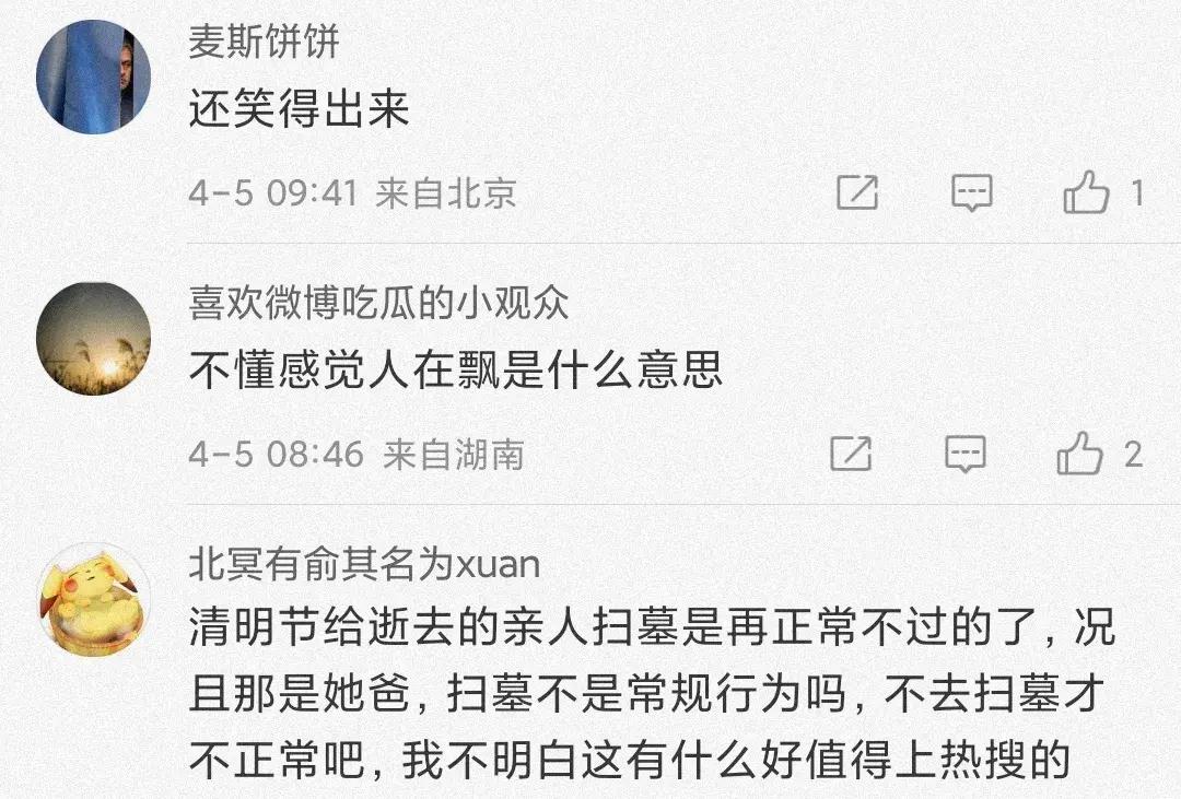 一些網友紛紛表示:掃墓還要分享到網絡,祭拜父親還一身的起牀氣,這個吐舌頭的表情,到底啥意思?這種日子,應該嚴肅,還笑的出來,不太合適吧。