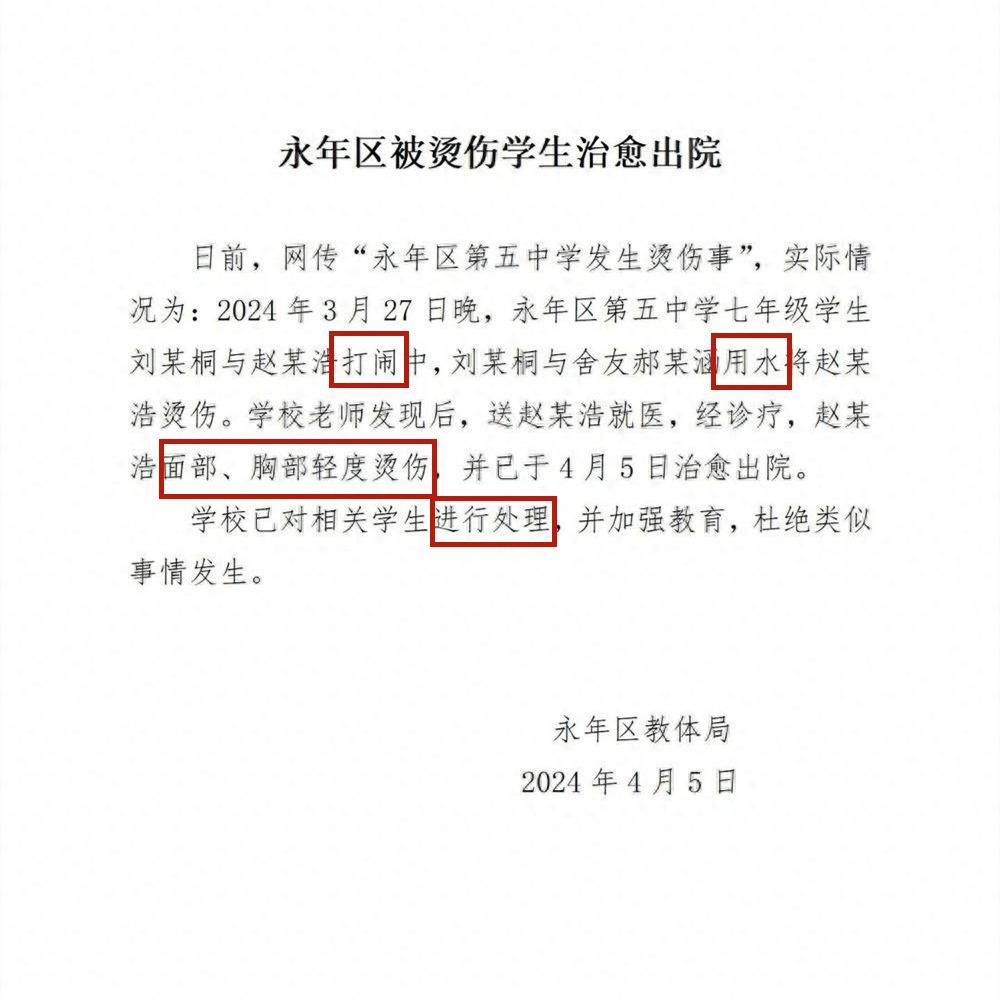 2024年3月27日晚,永年區第五中學七年級學生劉某桐和郝某涵用水將趙某浩燙傷。學校老師發現後,將趙某浩送醫。