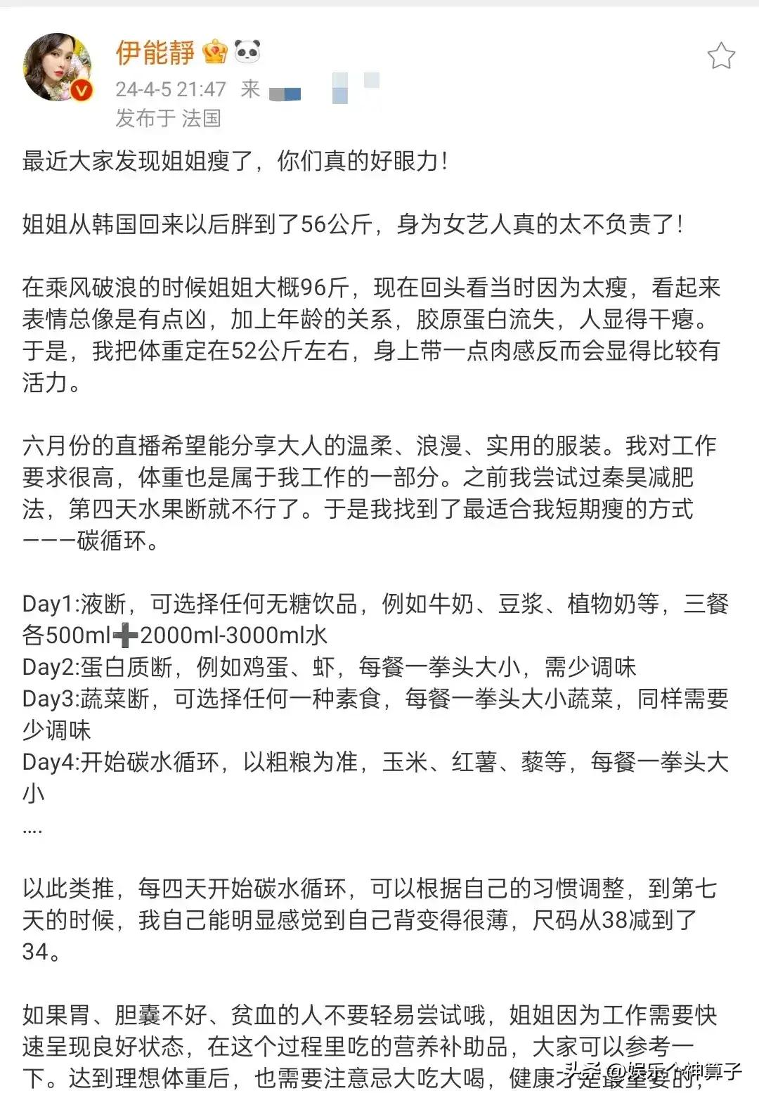體重56公斤還不滿意,伊能靜10天瘦了12斤,分享碳循環減肥方式